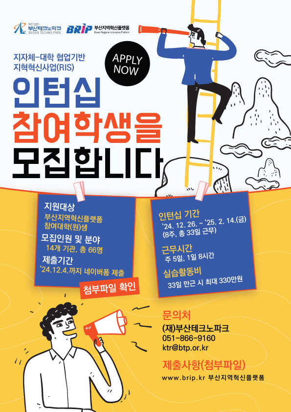 지자체-대학 협업기반 지역혁신사업(RIS)의 일환으로 부산지역혁신플랫폼 참여대학(원)생을 위해 운영하는 「지역혁신기관 직무체험 인턴십 프로그램」을 안내합니다.