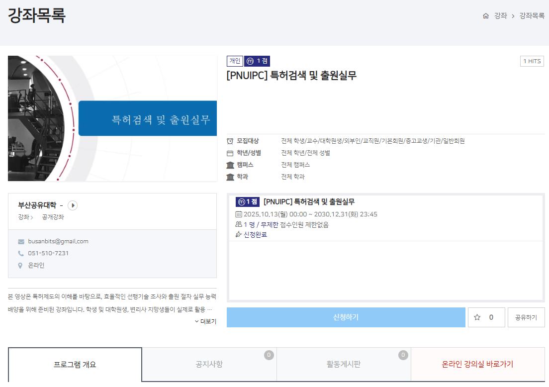 부산대학교 IP중점대학사업단에서 아래와 같이 오픈강좌를 개설하여 운영하오니 관심있는 분들의 많은 참여 바랍니다.