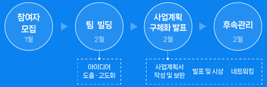 - 팀구성 및 팀별 아이디어 도출부터 비즈니스모델 구축 등 빌드업 과정을 통해 창업의 과정에 대해서 이해하고, 창업역량 강화