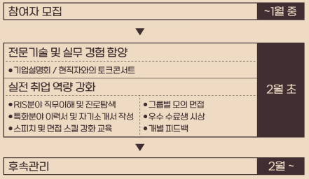 - 이력서 및 자기소개서 작성, 면접 및 스피치 스킬 등 취업 역량 강화 교육